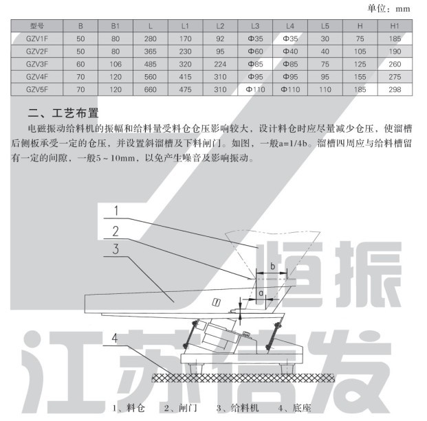 電磁振動給料機的振幅和給料量受料倉倉壓影響較大,設(shè)計料倉時應(yīng)盡量減少倉壓,使溜咀后側(cè)板承受一定的倉壓,并設(shè)置斜溜沮及下料閘門。如圖,一般a=1/4b。溜咀四周應(yīng)與給料槽留有一定的間隙,一般5~10mm,以免產(chǎn)生噪音及影響振動。